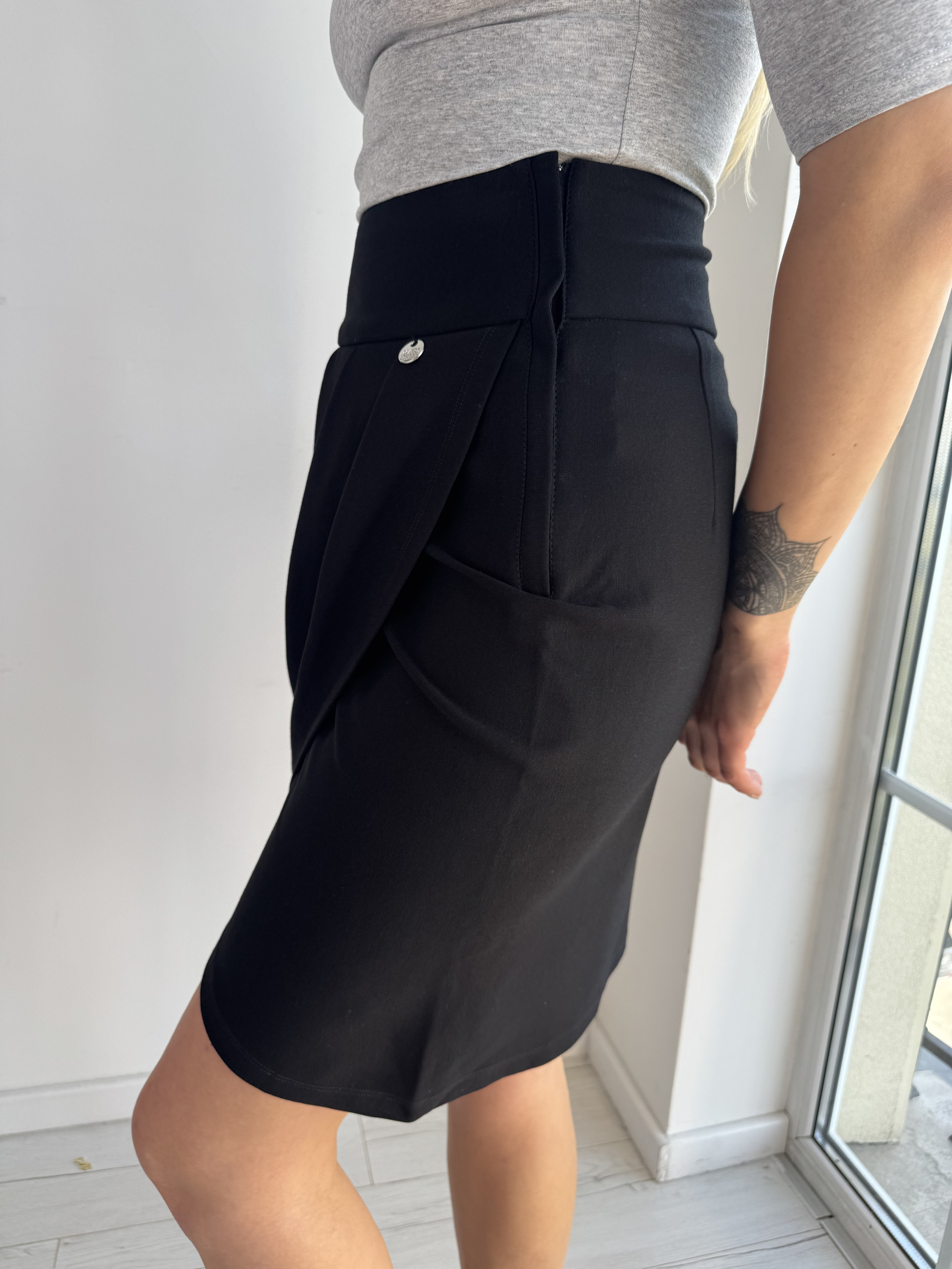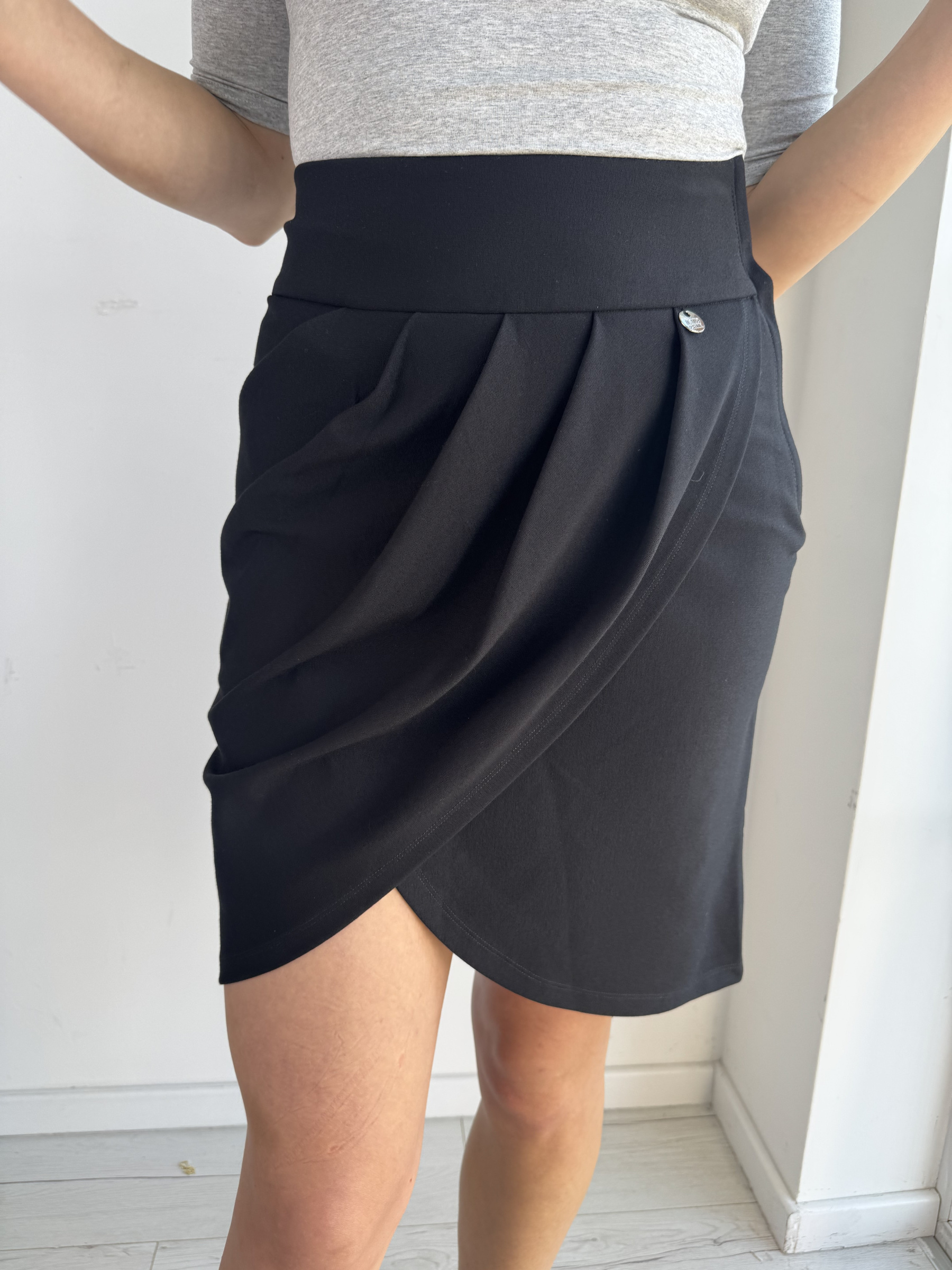Sukňa z elastického materiálu s prekrývajúcim sa, skladaným dizajnom vpredu, pevným pásom, zapínaním na zips na boku a malým kovovým logom značky.