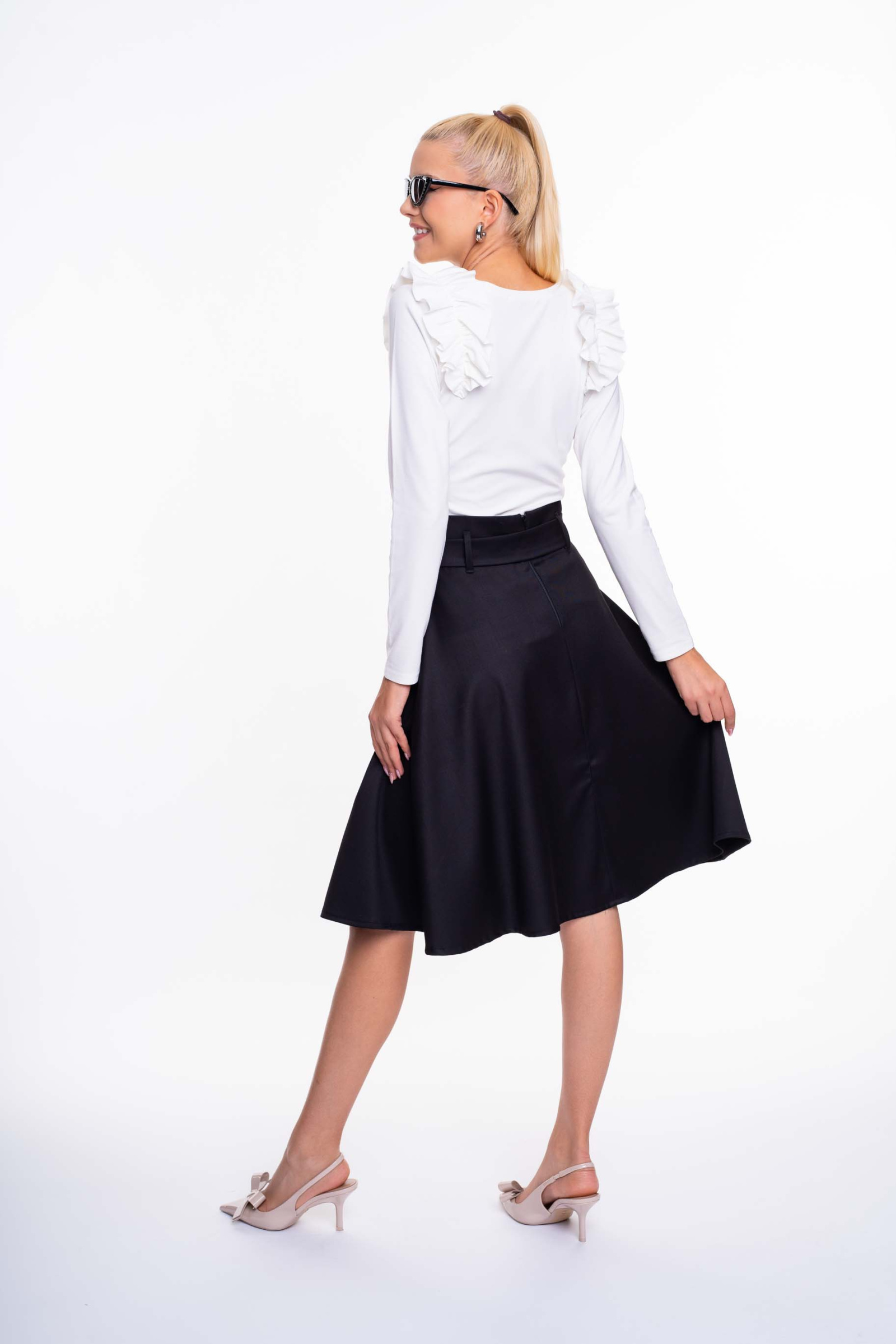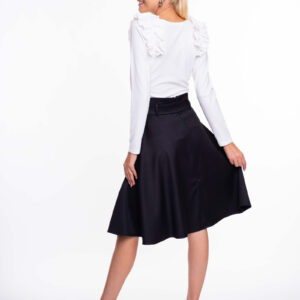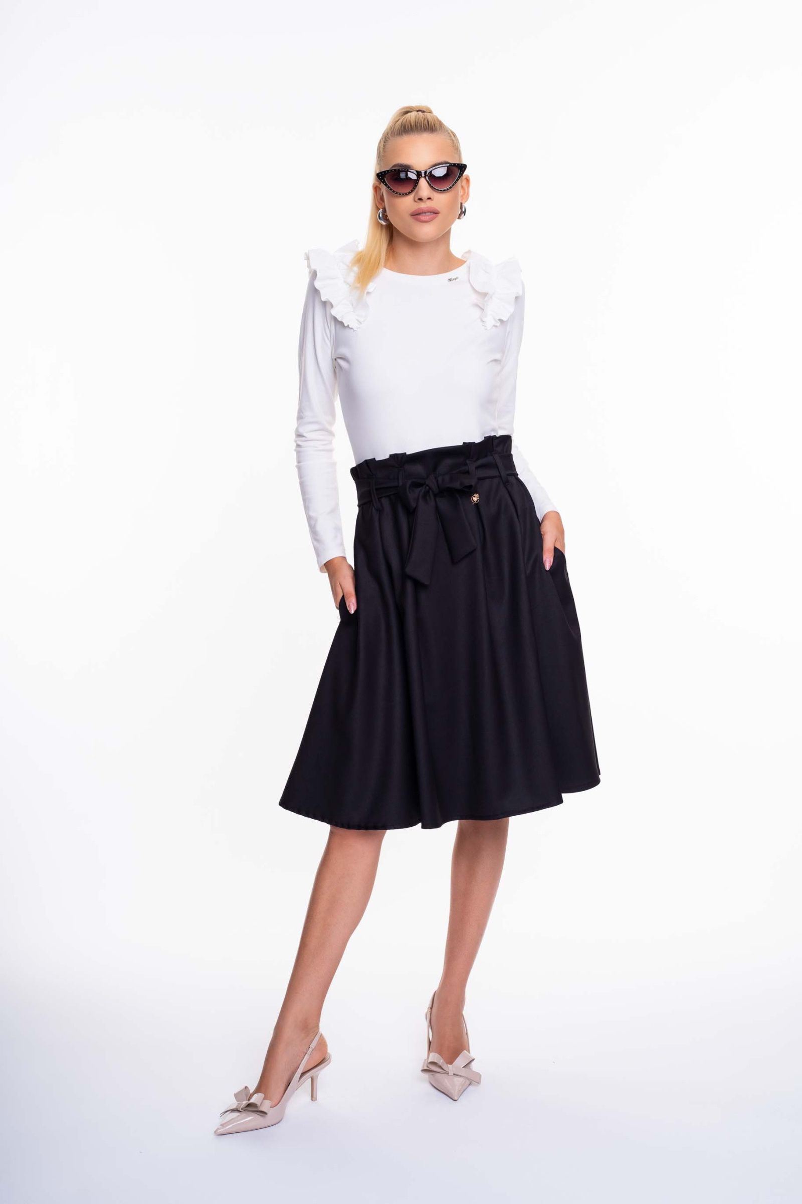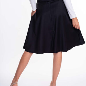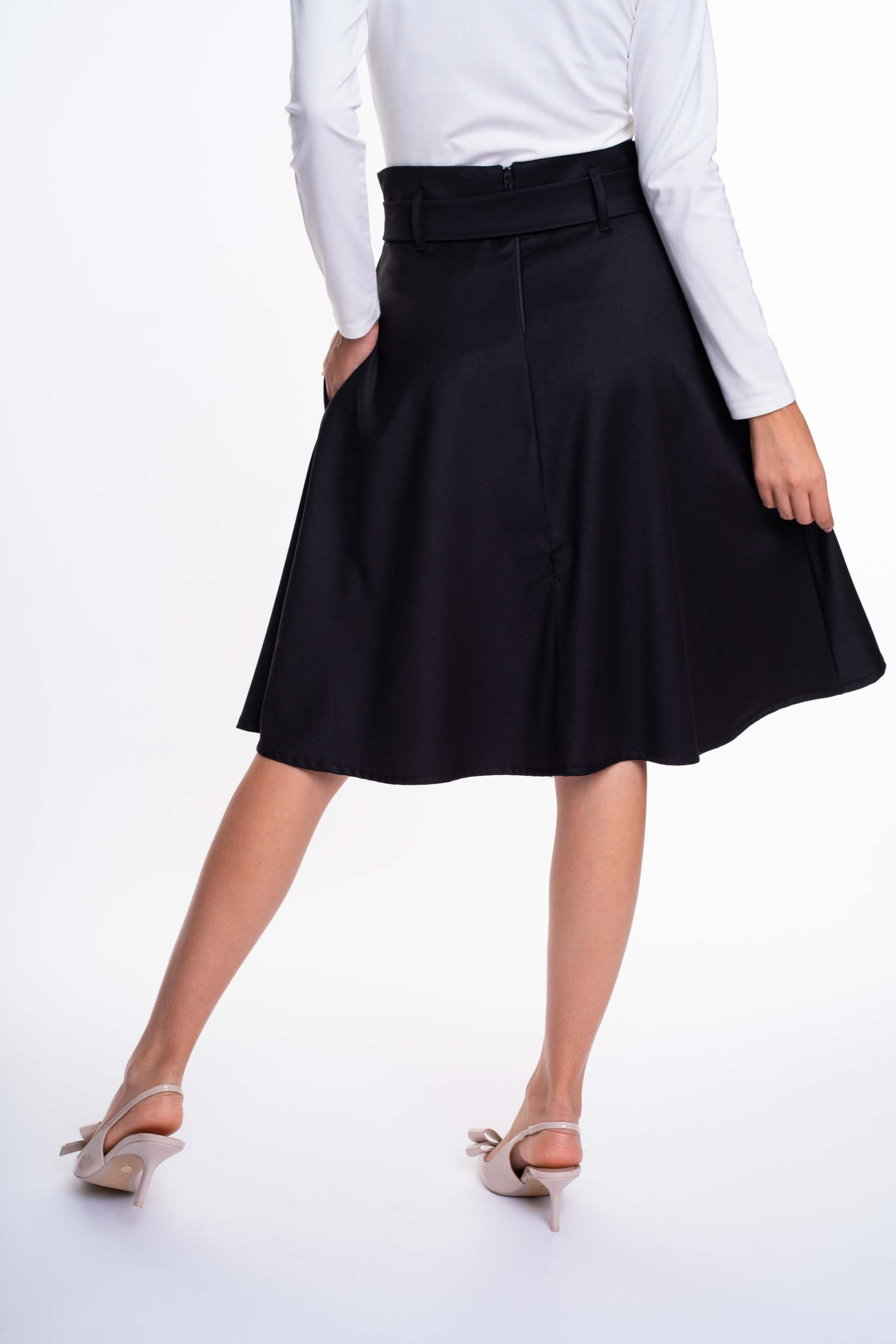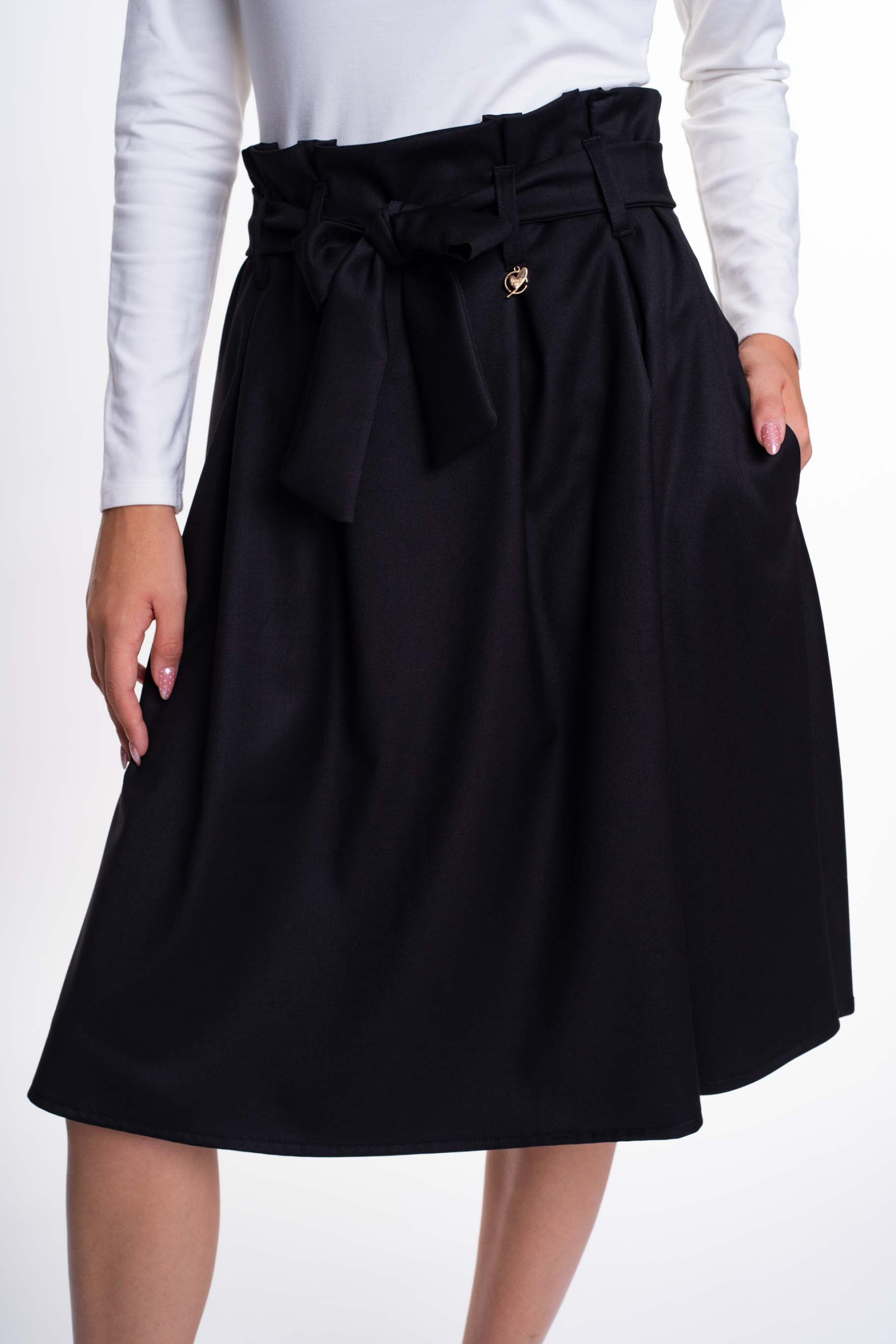 Sukňa áčkového strihu po kolená z mierne elastickej látky s vreckami, zaväzovaním z rovnakej látky, zapínaním na zips na chrbte a malým kovovým logom značky.