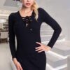 Úzke šaty z elastického materiálu, s výstrihom a malým kovovým logom značky.