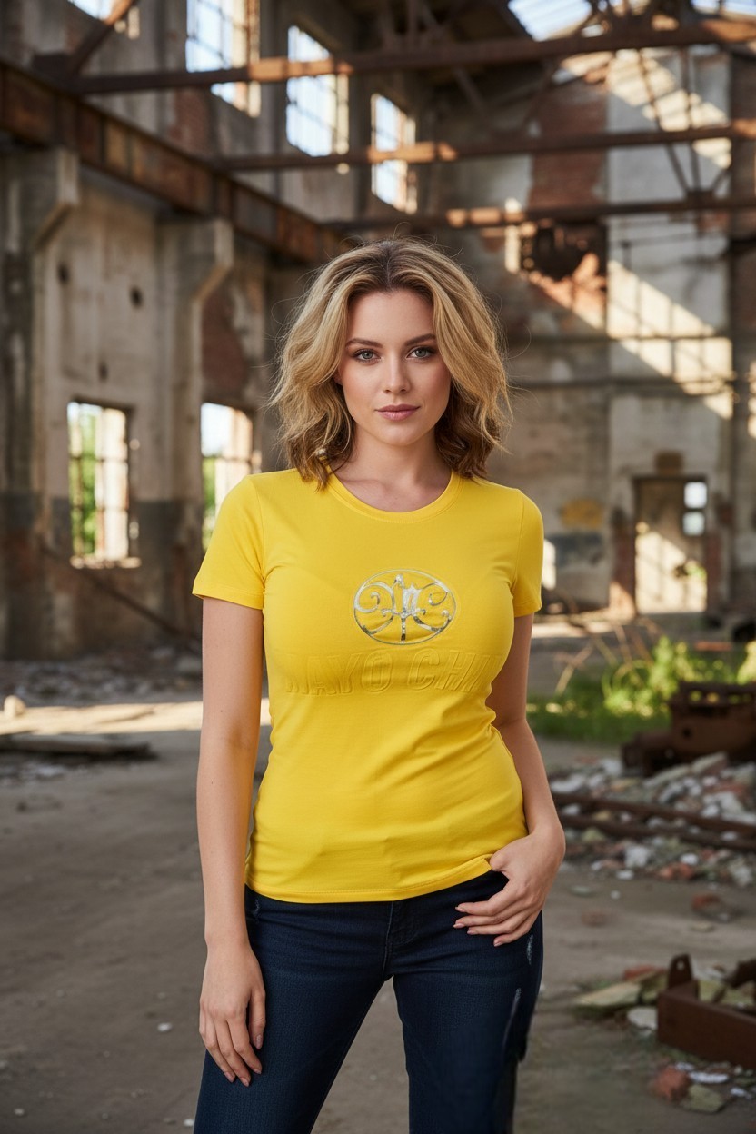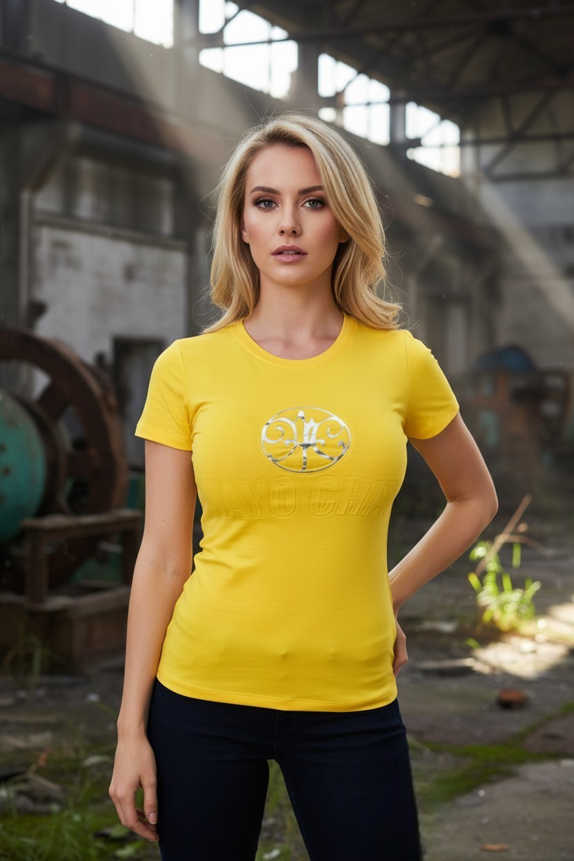 Tričko s krátkym rukávom z elastického bavlneného materiálu, so striebornou fóliou a perforovaným nápisom MAYO CHIX na prednej strane